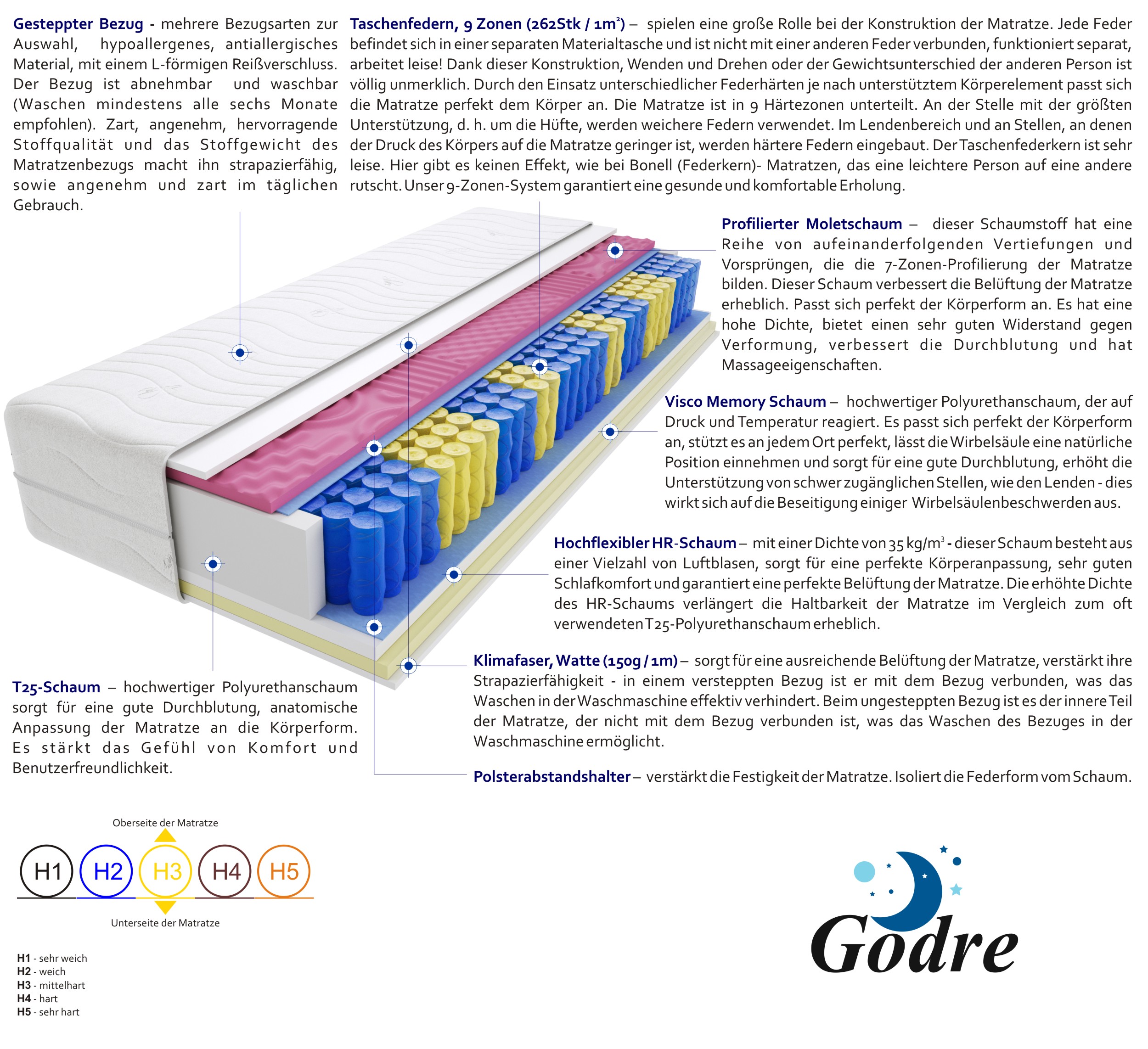 Filz, Gesteppter Bezug, Hochelastischer HR-Schaum, Klimafaser, Profilierter Molet Schaum 3cm, T25-Schaum, Taschenfedern, Visco Memory Schaum 2 cm