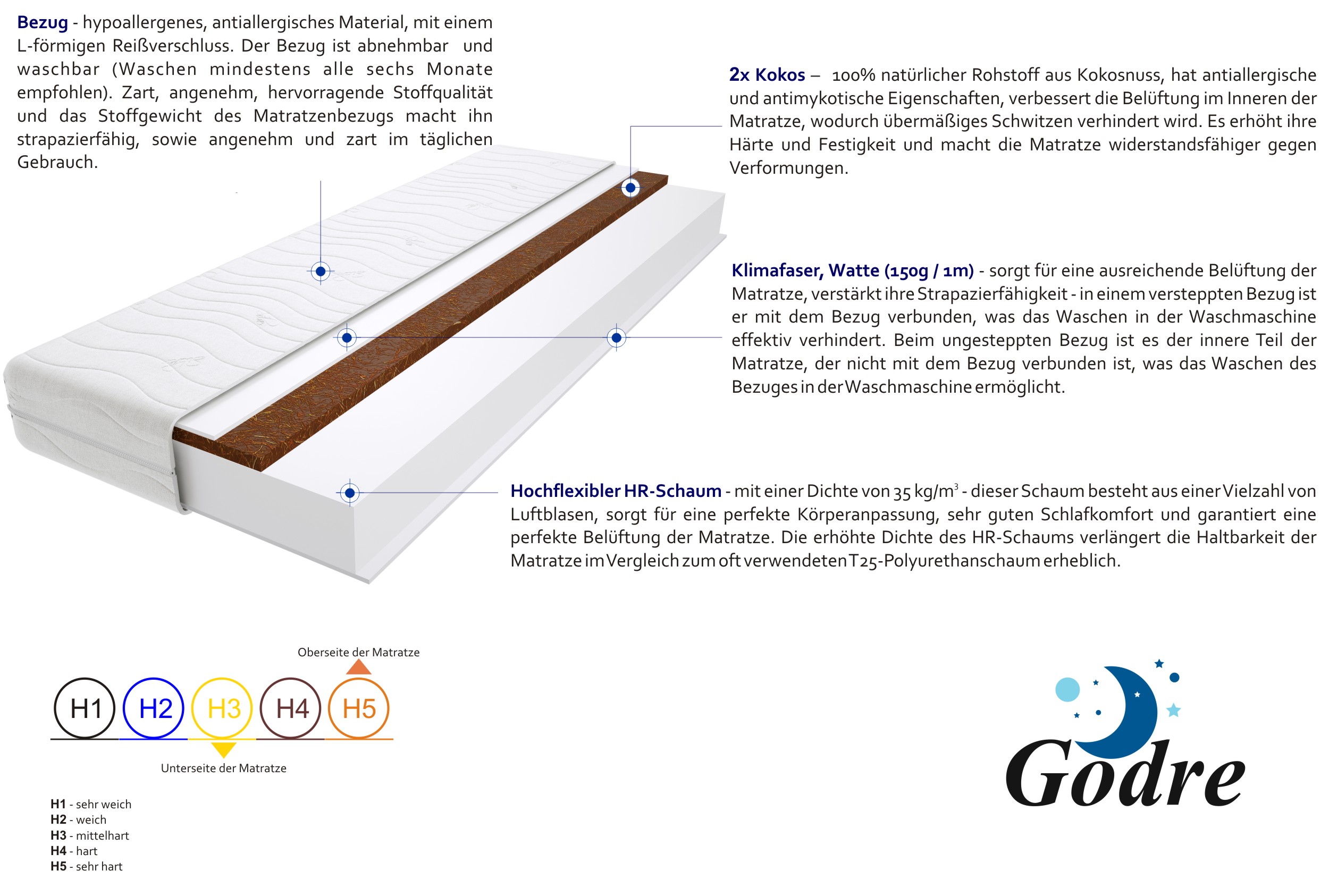 mit einer Dichte von 35 kg/m3 – dieser Schaum besteht aus einer Vielzahl von Luftblasen, sorgt für eine perfekte Körperanpassung, sehr guten Schlafkomfort und garantiert eine perfekte Belüftung der Matratze. Die erhöhte Dichte des HR-Schaums verlängert die Haltbarkeit der Matratze im Vergleich zum oft verwendeten T25-Polyurethanschaum erheblich.