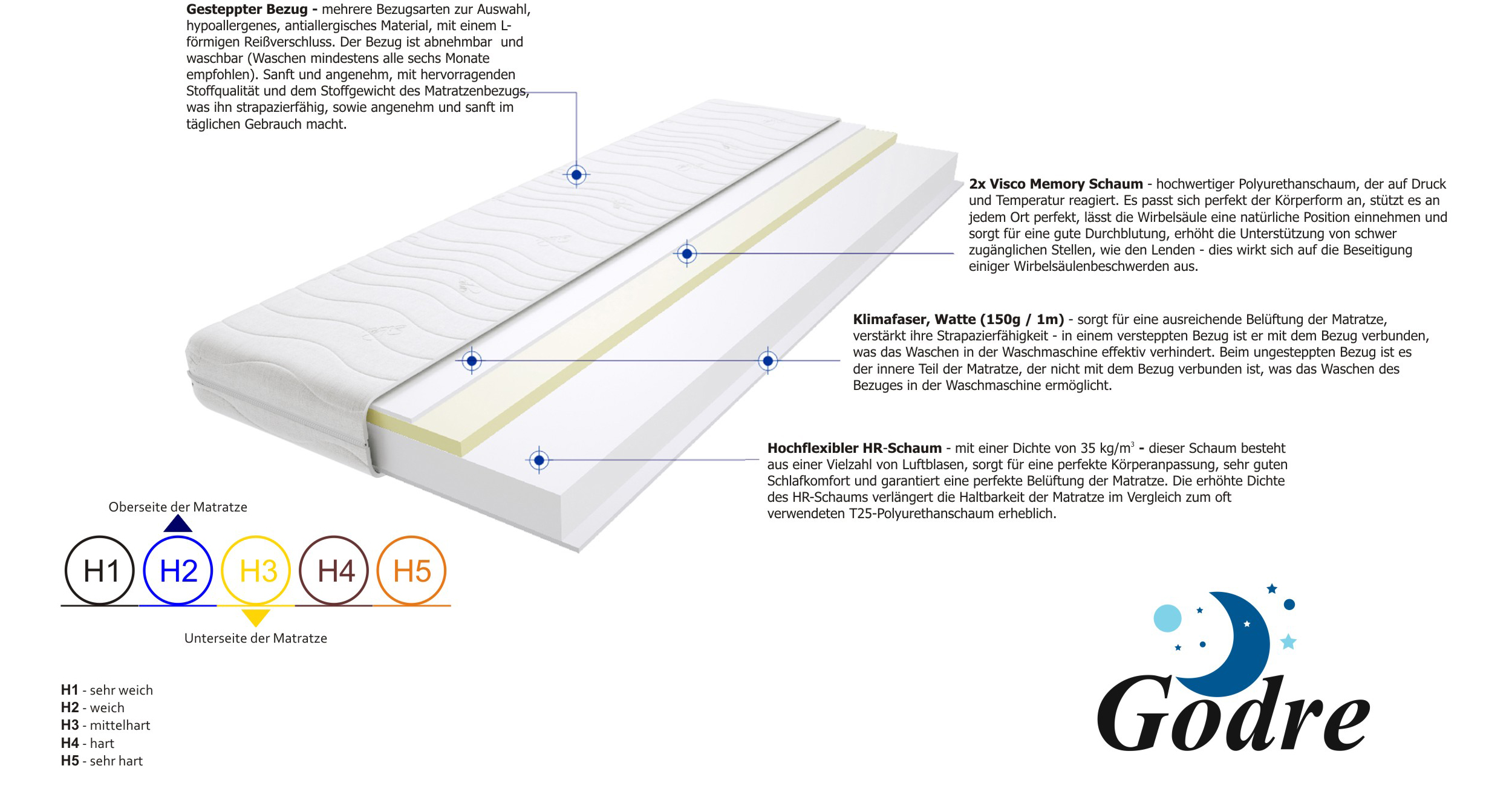mit einer Dichte von 35 kg/m3 – dieser Schaum besteht aus einer Vielzahl von Luftblasen, sorgt für eine perfekte Körperanpassung, sehr guten Schlafkomfort und garantiert eine perfekte Belüftung der Matratze. Die erhöhte Dichte des HR-Schaums verlängert die Haltbarkeit der Matratze im Vergleich zum oft verwendeten T25-Polyurethanschaum erheblich.