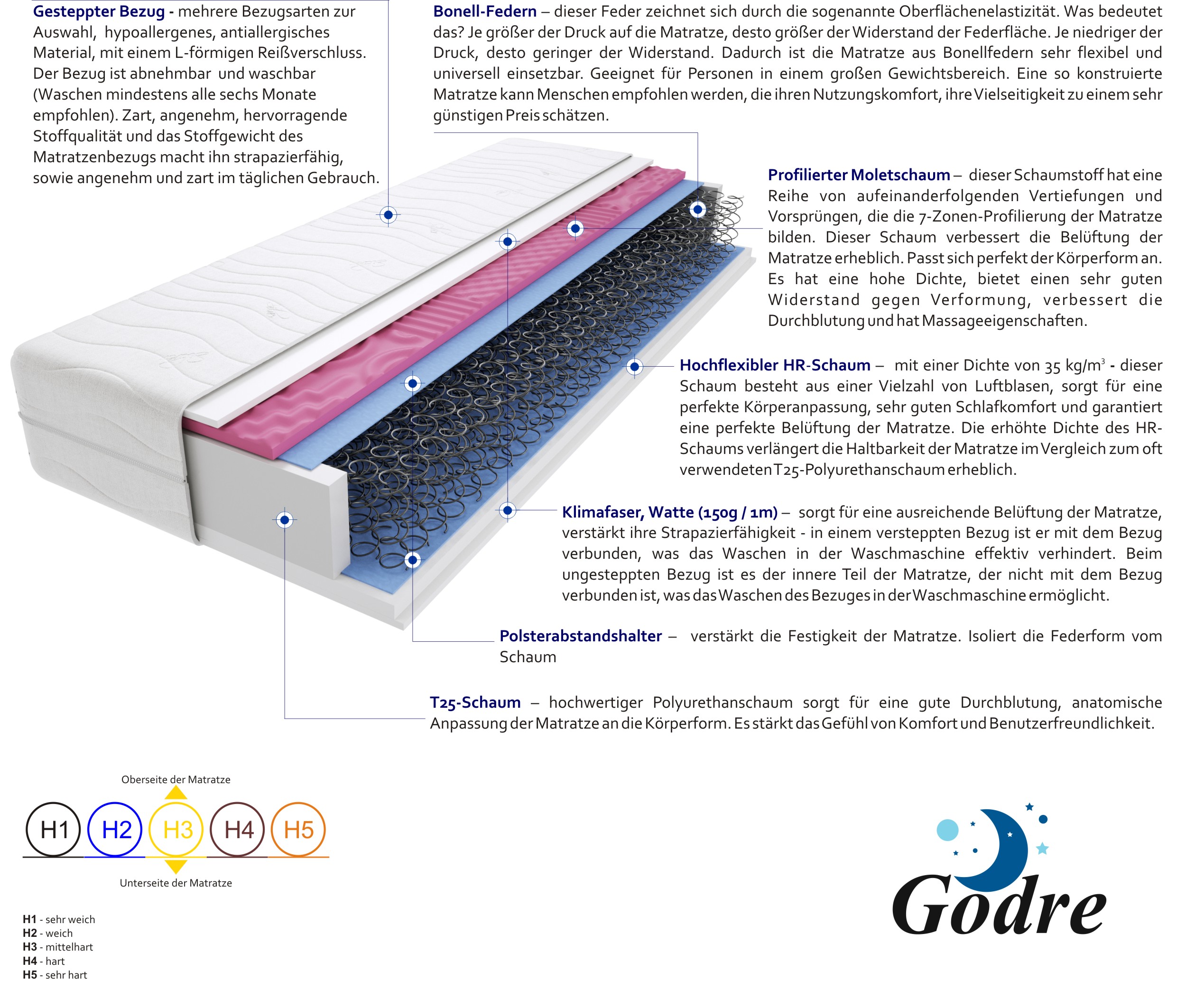 Bonellfedern, Filz, Gesteppter Bezug, Hochelastischer HR-Schaum, Klimafaser, Profilierter Molet Schaum 3cm, T25-Schaum