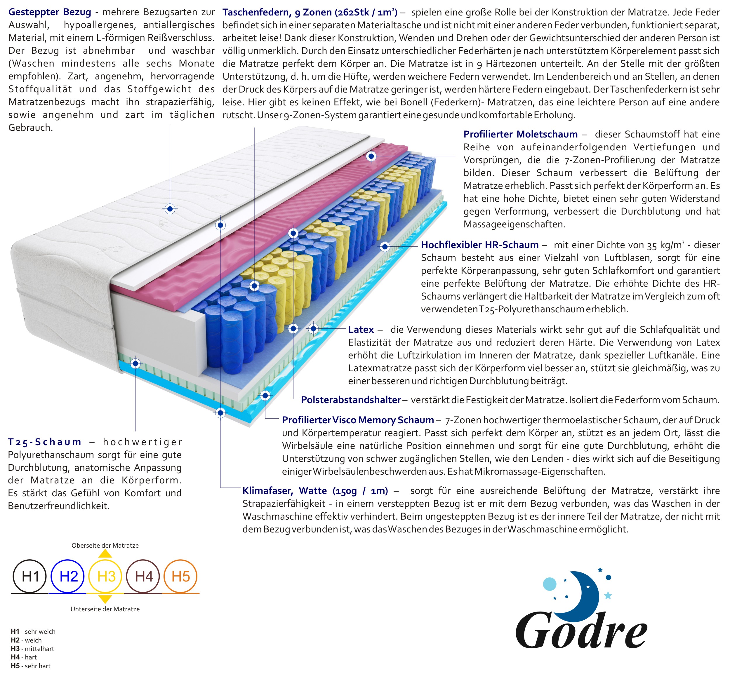 Filz, Gesteppter Bezug, Hochelastischer HR-Schaum, Klimafaser, Latex 2 cm, Profilierter Molet Schaum 3cm, Profilierter Visco Memory Schaum 2 cm, T25-Schaum, Taschenfedern