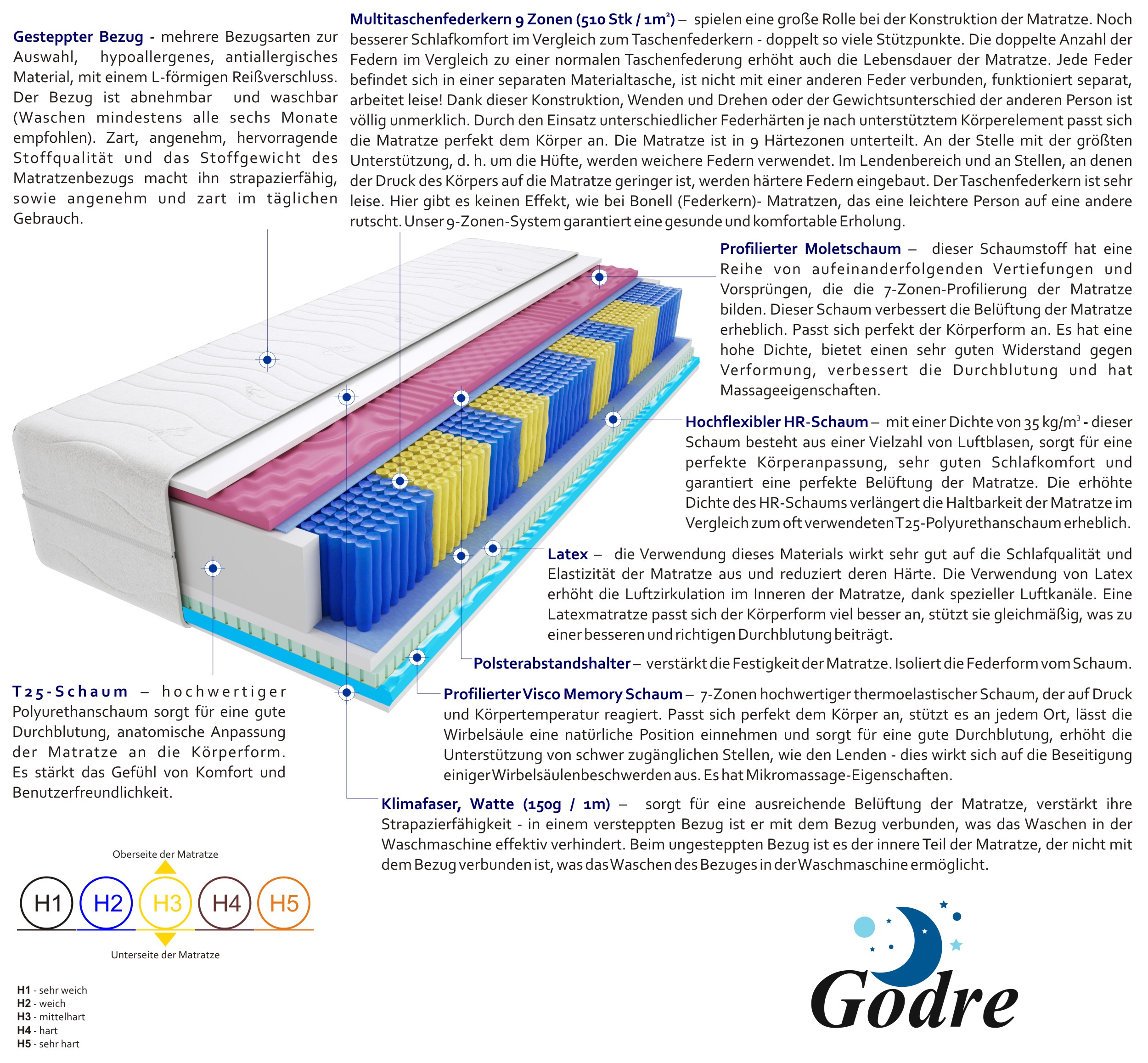 – spielen eine große Rolle bei der Konstruktion der Matratze. Noch besserer Schlafkomfort im Vergleich zum Taschenfederkern – doppelt so viele Stützpunkte. Die doppelte Anzahl der Federn im Vergleich zu einer normalen Taschenfederung erhöht auch die Lebensdauer der Matratze. Jede Feder befindet sich in einer separaten Materialtasche, ist nicht mit einer anderen Feder verbunden, funktioniert separat, arbeitet leise! Dank dieser Konstruktion, Wenden und Drehen oder der Gewichtsunterschied der anderen Person ist völlig unmerklich. Durch den Einsatz unterschiedlicher Federhärten je nach unterstütztem Körperelement passt sich die Matratze perfekt dem Körper an. Die Matratze ist in 9 Härtezonen unterteilt. An der Stelle mit der größten Unterstützung, d.h. um die Hüfte, werden weichere Federn verwendet. Im Lendenbereich und an Stellen, an denen der Druck des Körpers auf die Matratze geringer ist, werden härtere Federn eingebaut. Der Taschenfederkern ist sehr leise. Hier gibt es keinen Welleneffekt, wie bei Bonellfedernkernmatratzen, das eine leichtere Person auf eine andere rutscht. Unser 9-Zonen-System garantiert eine gesunde und komfortable Erholung.