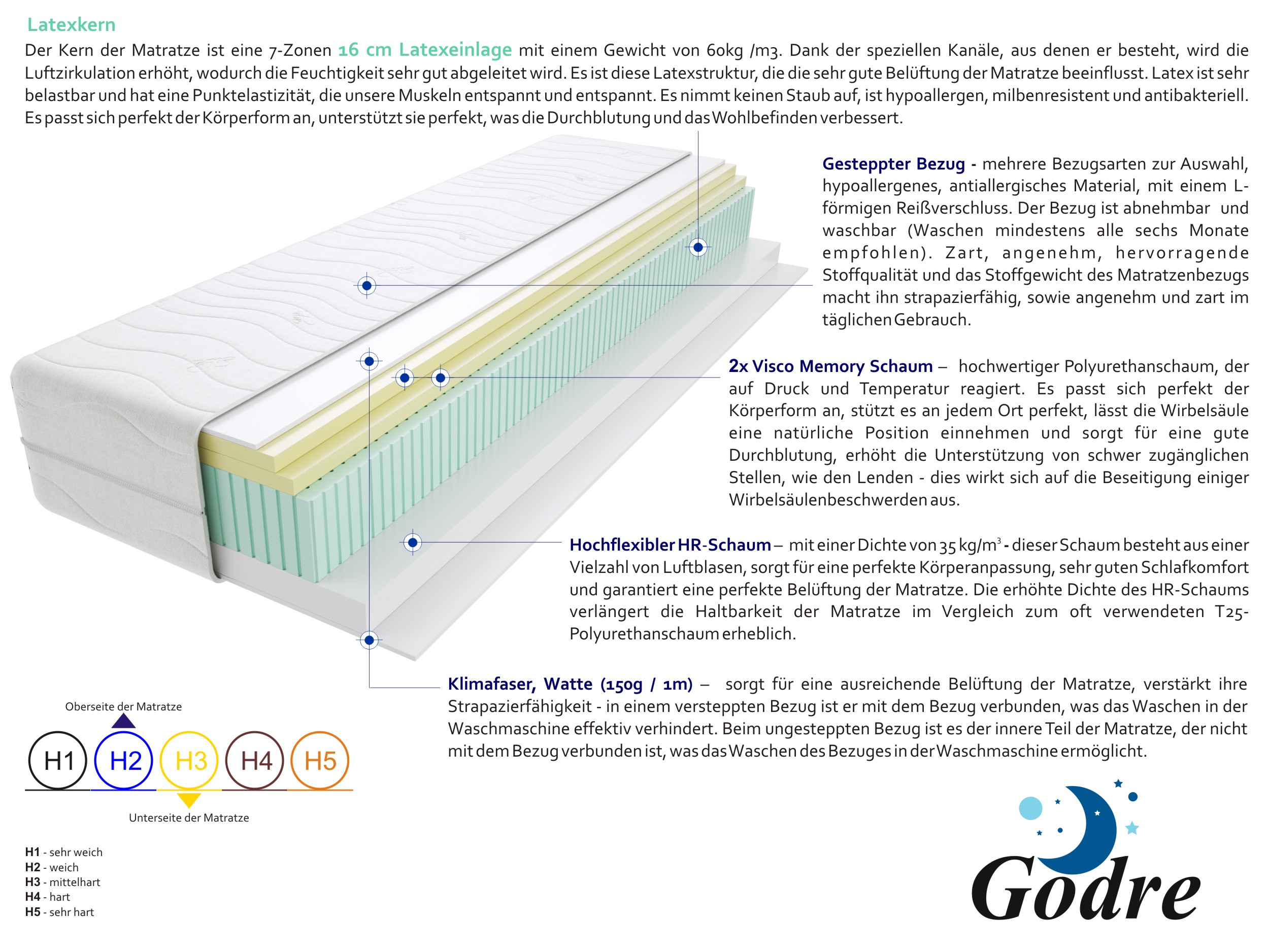 – der Kern der Matratze ist eine 7-Zonen 16 cm Latexeinlage mit einem Gewicht von 60kg /m3. Dank der speziellen Kanäle, aus denen er besteht, wird die Luftzirkulation erhöht, wodurch die Feuchtigkeit sehr gut abgeleitet wird. Es ist diese Latexstruktur, die die sehr gute Belüftung der Matratze beeinflusst. Latex ist sehr belastbar und hat eine Punktelastizität, die unsere Muskeln entspannt. Es nimmt keinen Staub auf, ist hypoallergen, milbenresistent und antibakteriell. Es passt sich perfekt der Körperform an, unterstützt sie perfekt, was die Durchblutung und das Wohlbefinden verbessert.