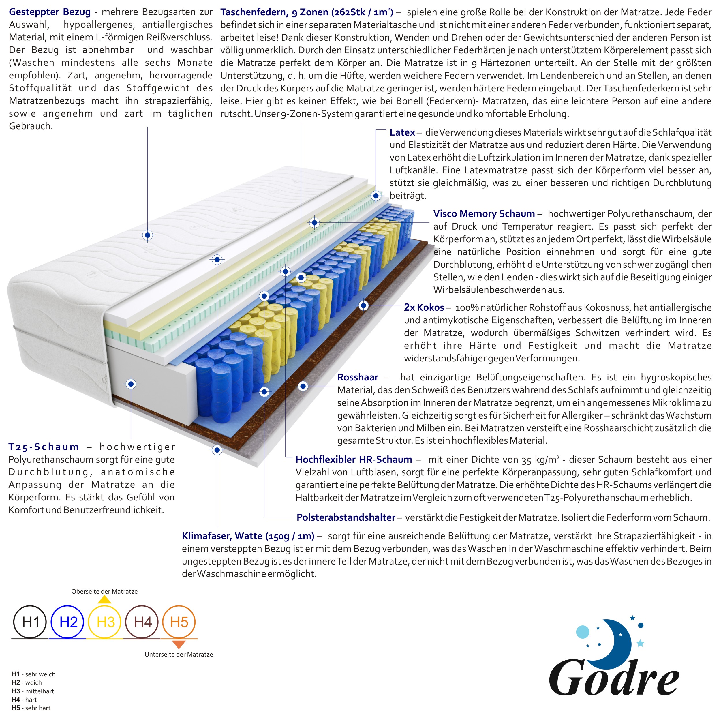 2x Kokos, Filz, Gesteppter Bezug, Hochelastischer HR-Schaum, Klimafaser, Latex 2 cm, Rosshaar, T25-Schaum, Taschenfedern, Visco Memory Schaum 2 cm