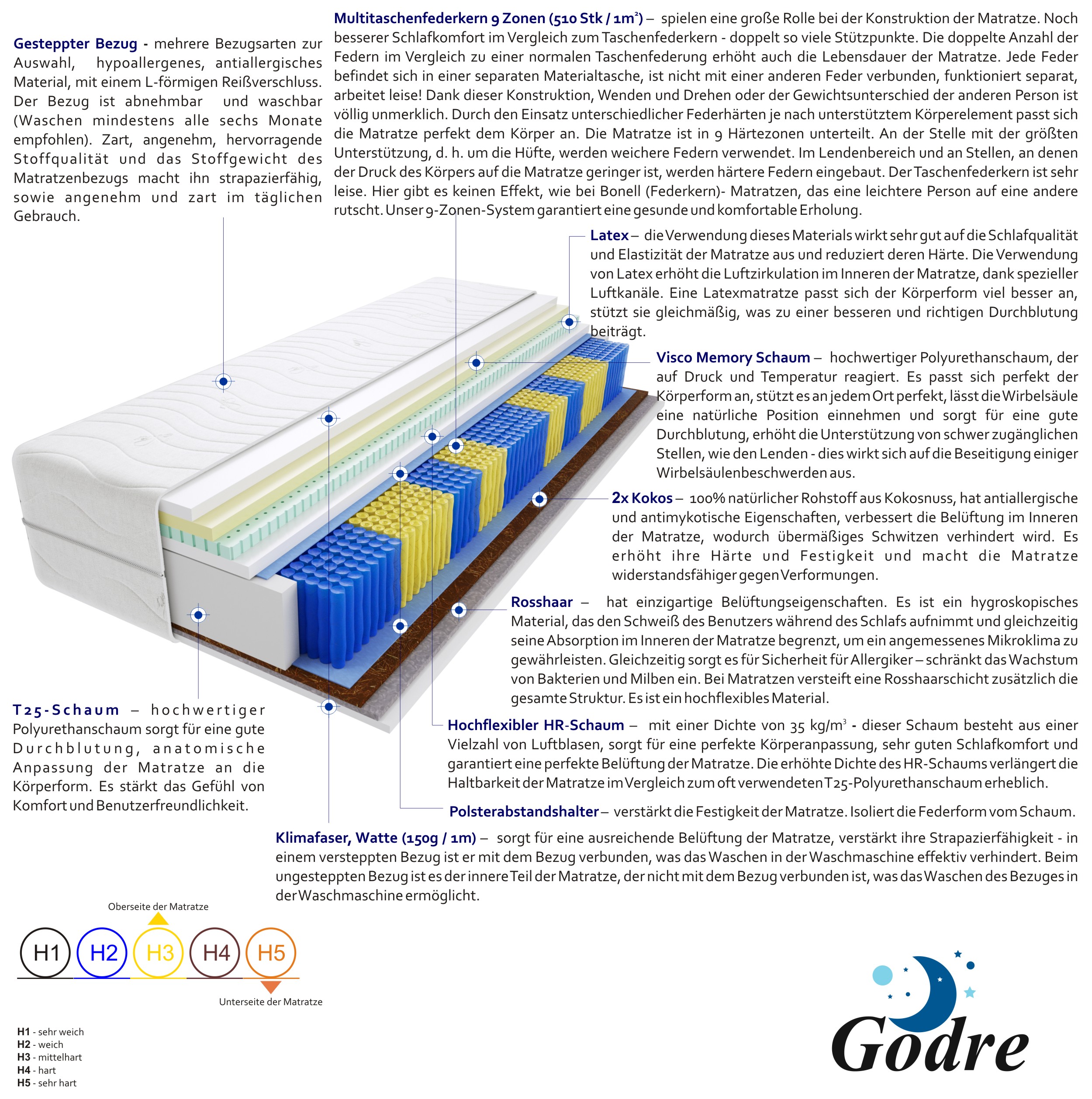 2x Kokos, Filz, Gesteppter Bezug, Hochelastischer HR-Schaum, Klimafaser, Latex 2 cm, Multitaschenfedern, Rosshaar, T25-Schaum, Visco Memory Schaum 2 cm