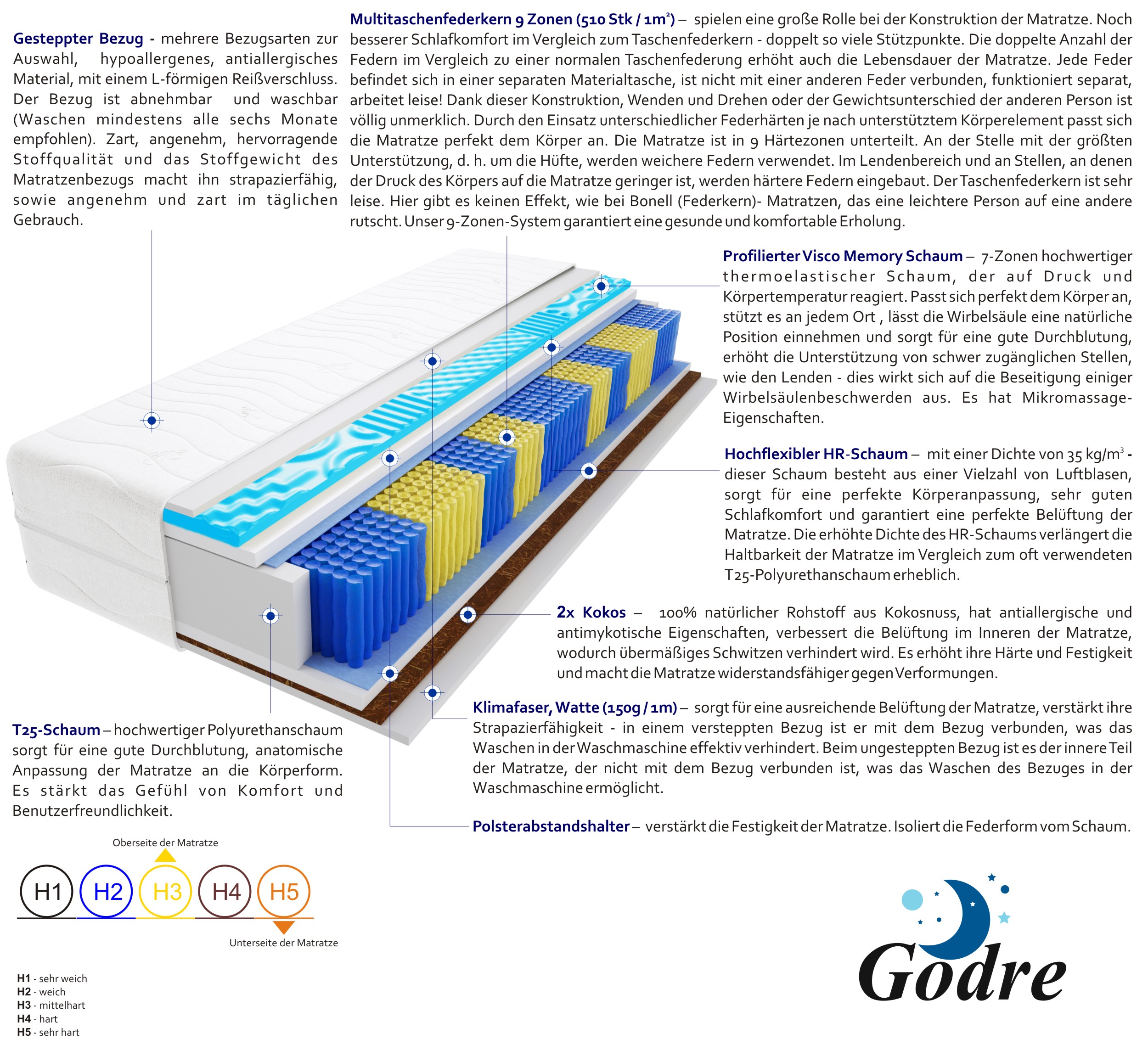 multitaschenfedern, hochelastischer-hr-schaum, profilierter-visco-memory-schaum-2-cm, 2x-kokos, t25-schaum, klimafaser, filz, gesteppter-bezug