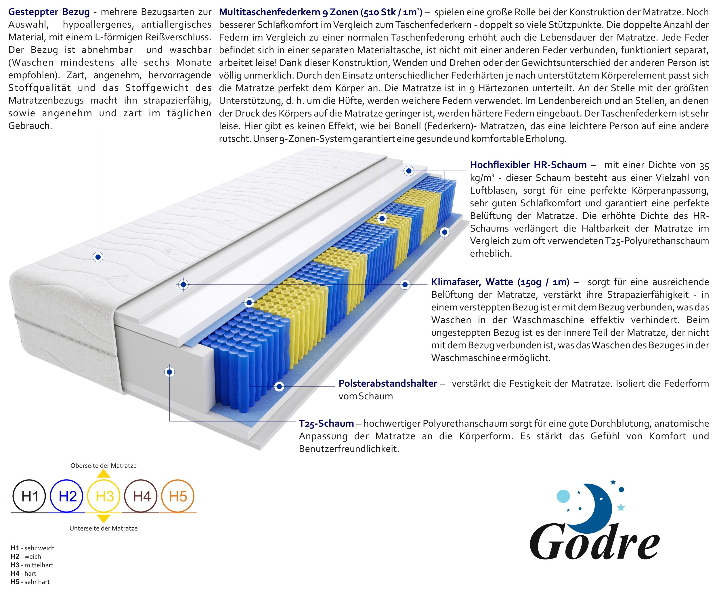 – spielen eine große Rolle bei der Konstruktion der Matratze. Noch besserer Schlafkomfort im Vergleich zum Taschenfederkern – doppelt so viele Stützpunkte. Die doppelte Anzahl der Federn im Vergleich zu einer normalen Taschenfederung erhöht auch die Lebensdauer der Matratze. Jede Feder befindet sich in einer separaten Materialtasche, ist nicht mit einer anderen Feder verbunden, funktioniert separat, arbeitet leise! Dank dieser Konstruktion, Wenden und Drehen oder der Gewichtsunterschied der anderen Person ist völlig unmerklich. Durch den Einsatz unterschiedlicher Federhärten je nach unterstütztem Körperelement passt sich die Matratze perfekt dem Körper an. Die Matratze ist in 9 Härtezonen unterteilt. An der Stelle mit der größten Unterstützung, d.h. um die Hüfte, werden weichere Federn verwendet. Im Lendenbereich und an Stellen, an denen der Druck des Körpers auf die Matratze geringer ist, werden härtere Federn eingebaut. Der Taschenfederkern ist sehr leise. Hier gibt es keinen Welleneffekt, wie bei Bonellfedernkernmatratzen, das eine leichtere Person auf eine andere rutscht. Unser 9-Zonen-System garantiert eine gesunde und komfortable Erholung.