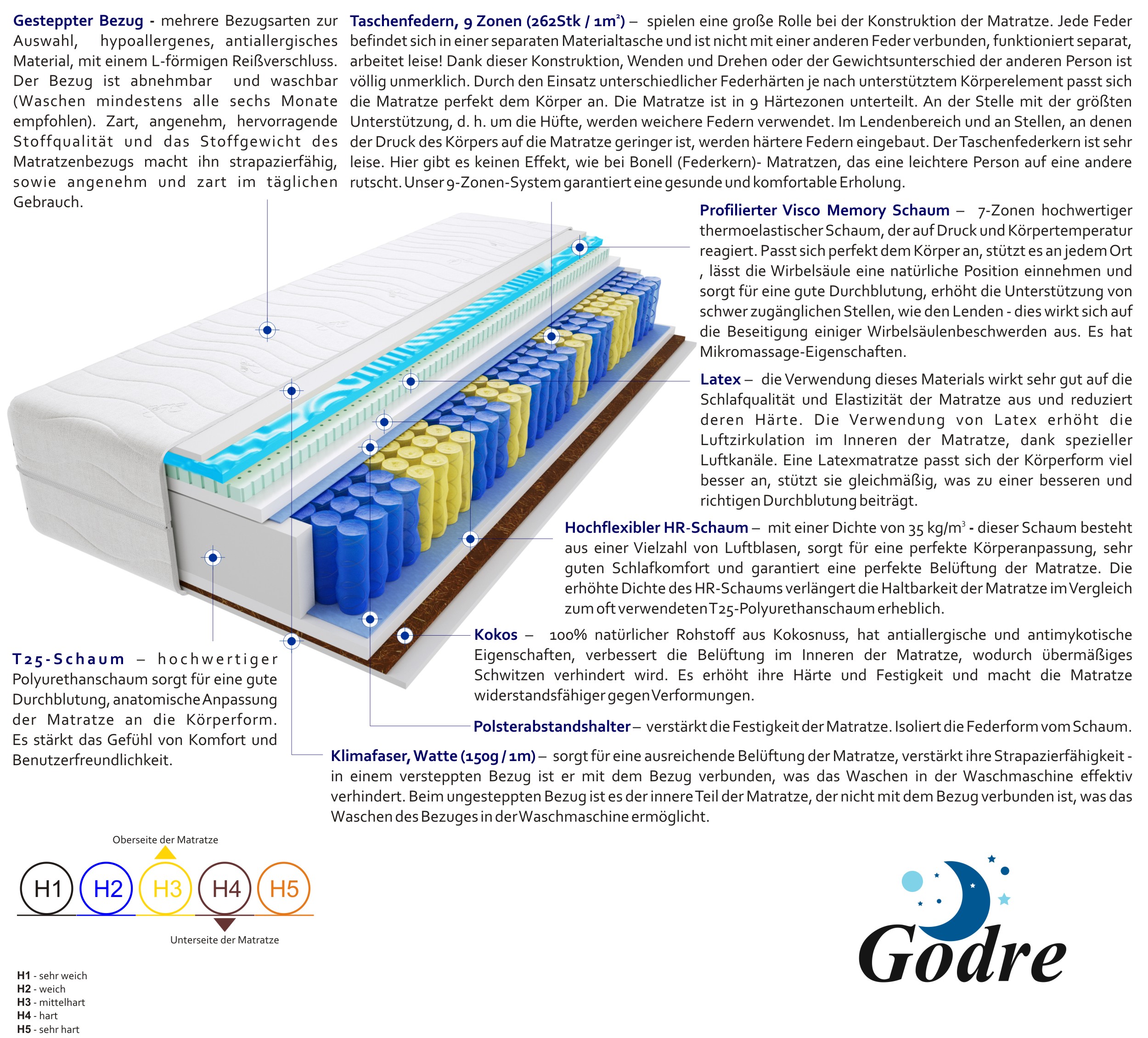 taschenfedern, hochelastischer-hr-schaum, latex-2-cm, profilierter-visco-memory-schaum-2-cm, kokos, t25-schaum, klimafaser, filz, gesteppter-bezug