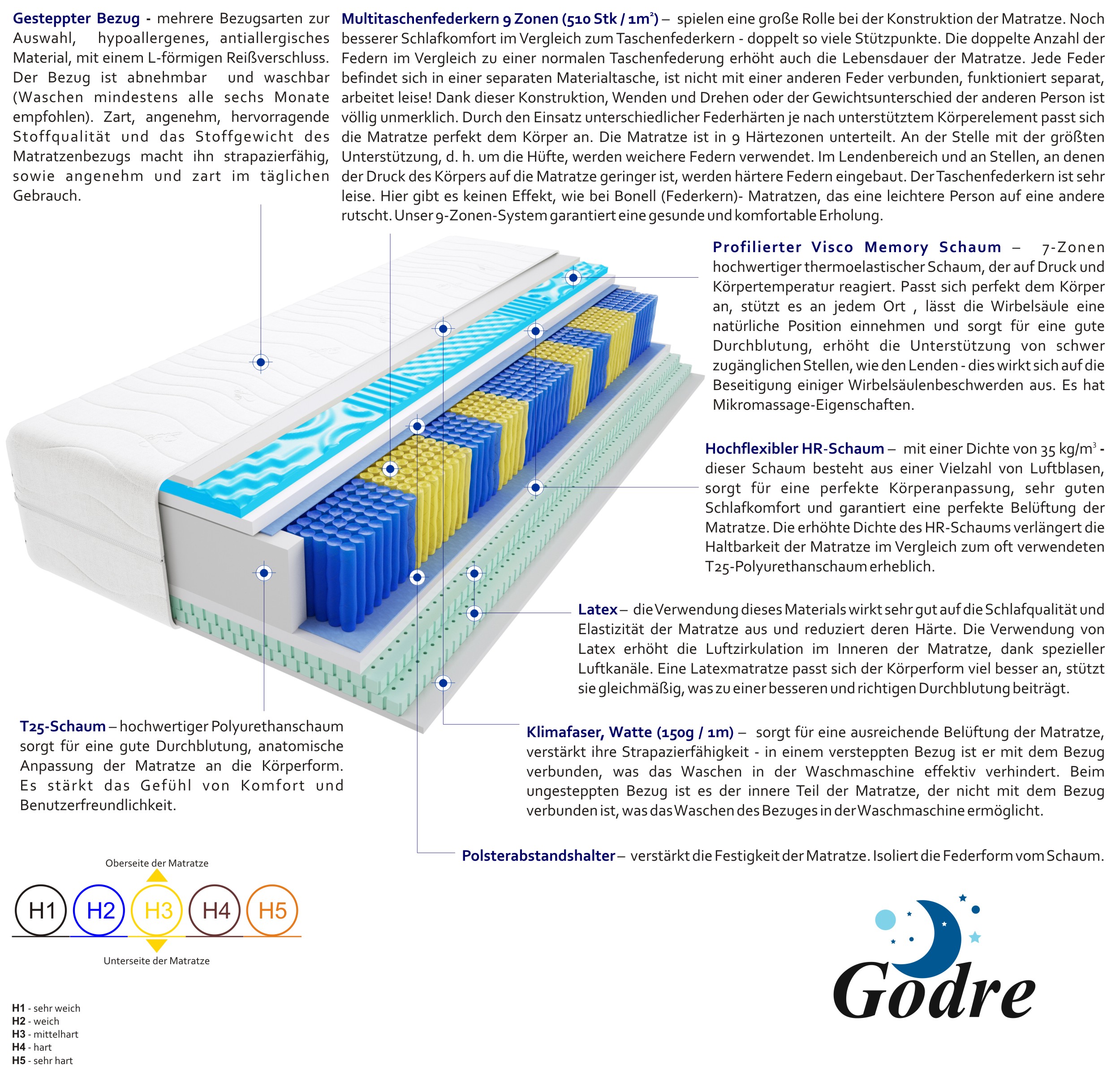 multitaschenfedern, hochelastischer-hr-schaum, 2x-latex-2-cm, profilierter-visco-memory-schaum-2-cm, t25-schaum, klimafaser, filz, gesteppter-bezug