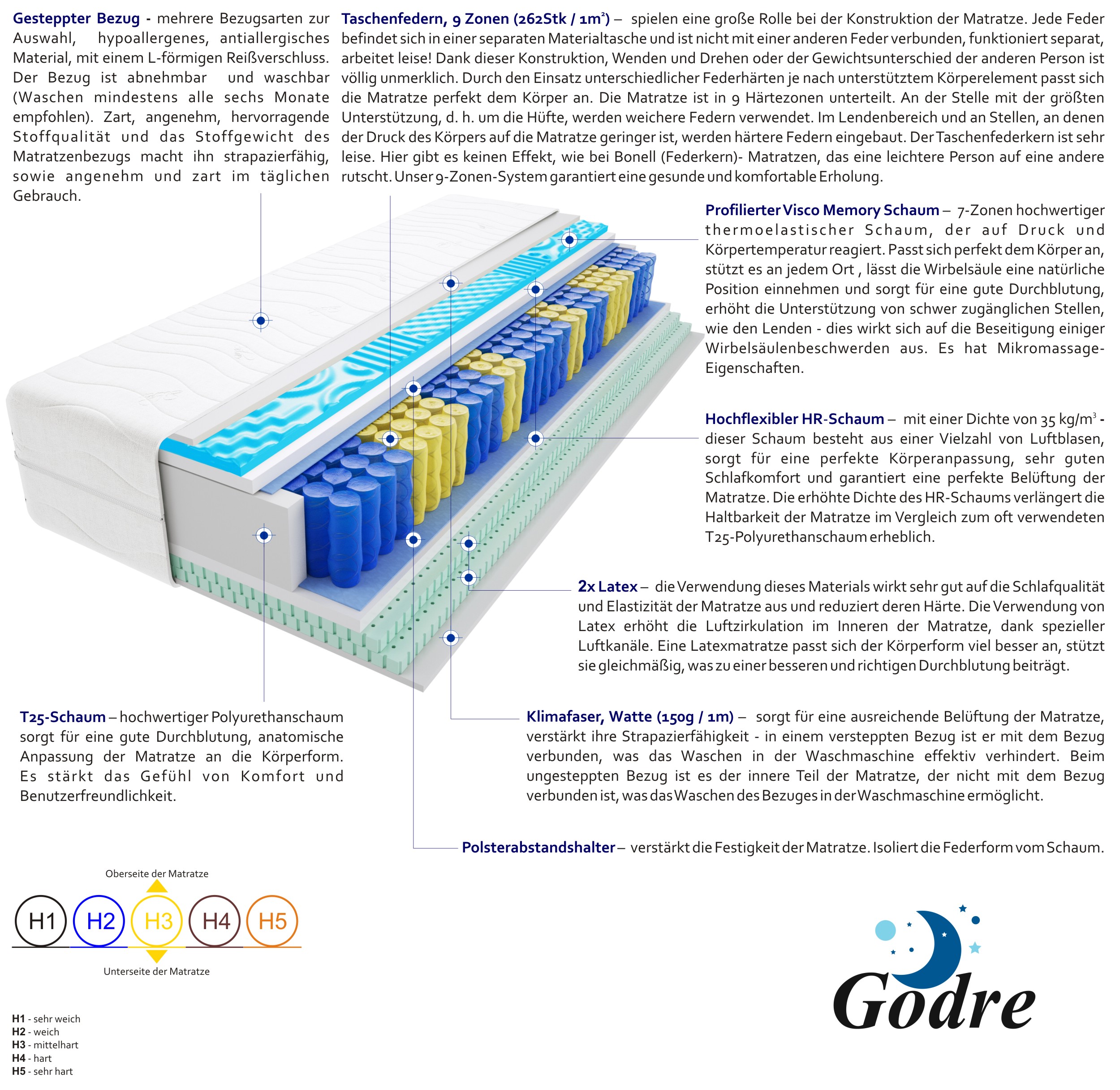 taschenfedern, hochelastischer-hr-schaum, 2x-latex-2-cm, profilierter-visco-memory-schaum-2-cm, t25-schaum, klimafaser, filz, gesteppter-bezug