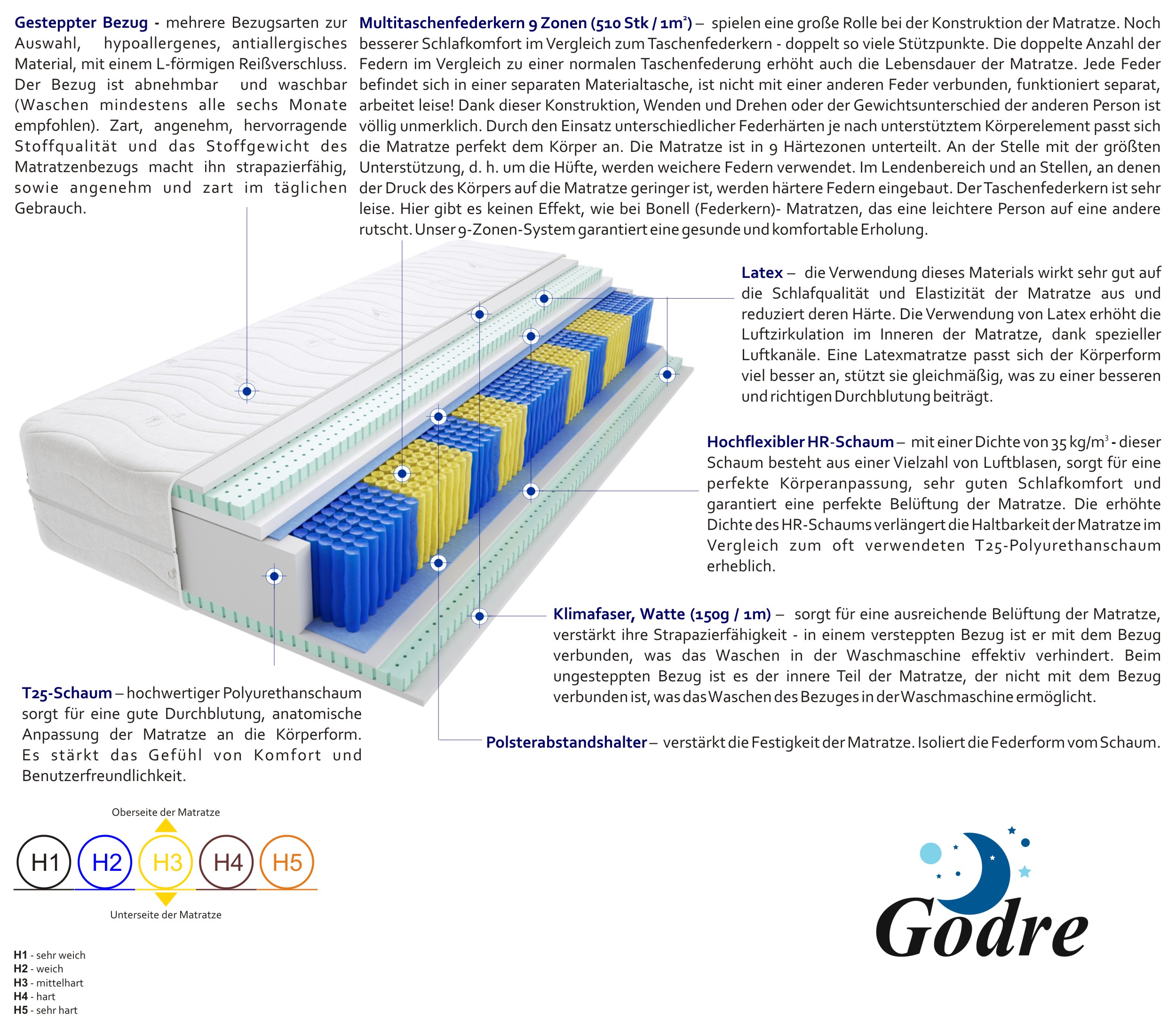 – spielen eine große Rolle bei der Konstruktion der Matratze. Noch besserer Schlafkomfort im Vergleich zum Taschenfederkern – doppelt so viele Stützpunkte. Die doppelte Anzahl der Federn im Vergleich zu einer normalen Taschenfederung erhöht auch die Lebensdauer der Matratze. Jede Feder befindet sich in einer separaten Materialtasche, ist nicht mit einer anderen Feder verbunden, funktioniert separat, arbeitet leise! Dank dieser Konstruktion, Wenden und Drehen oder der Gewichtsunterschied der anderen Person ist völlig unmerklich. Durch den Einsatz unterschiedlicher Federhärten je nach unterstütztem Körperelement passt sich die Matratze perfekt dem Körper an. Die Matratze ist in 9 Härtezonen unterteilt. An der Stelle mit der größten Unterstützung, d.h. um die Hüfte, werden weichere Federn verwendet. Im Lendenbereich und an Stellen, an denen der Druck des Körpers auf die Matratze geringer ist, werden härtere Federn eingebaut. Der Taschenfederkern ist sehr leise. Hier gibt es keinen Welleneffekt, wie bei Bonellfedernkernmatratzen, das eine leichtere Person auf eine andere rutscht. Unser 9-Zonen-System garantiert eine gesunde und komfortable Erholung.