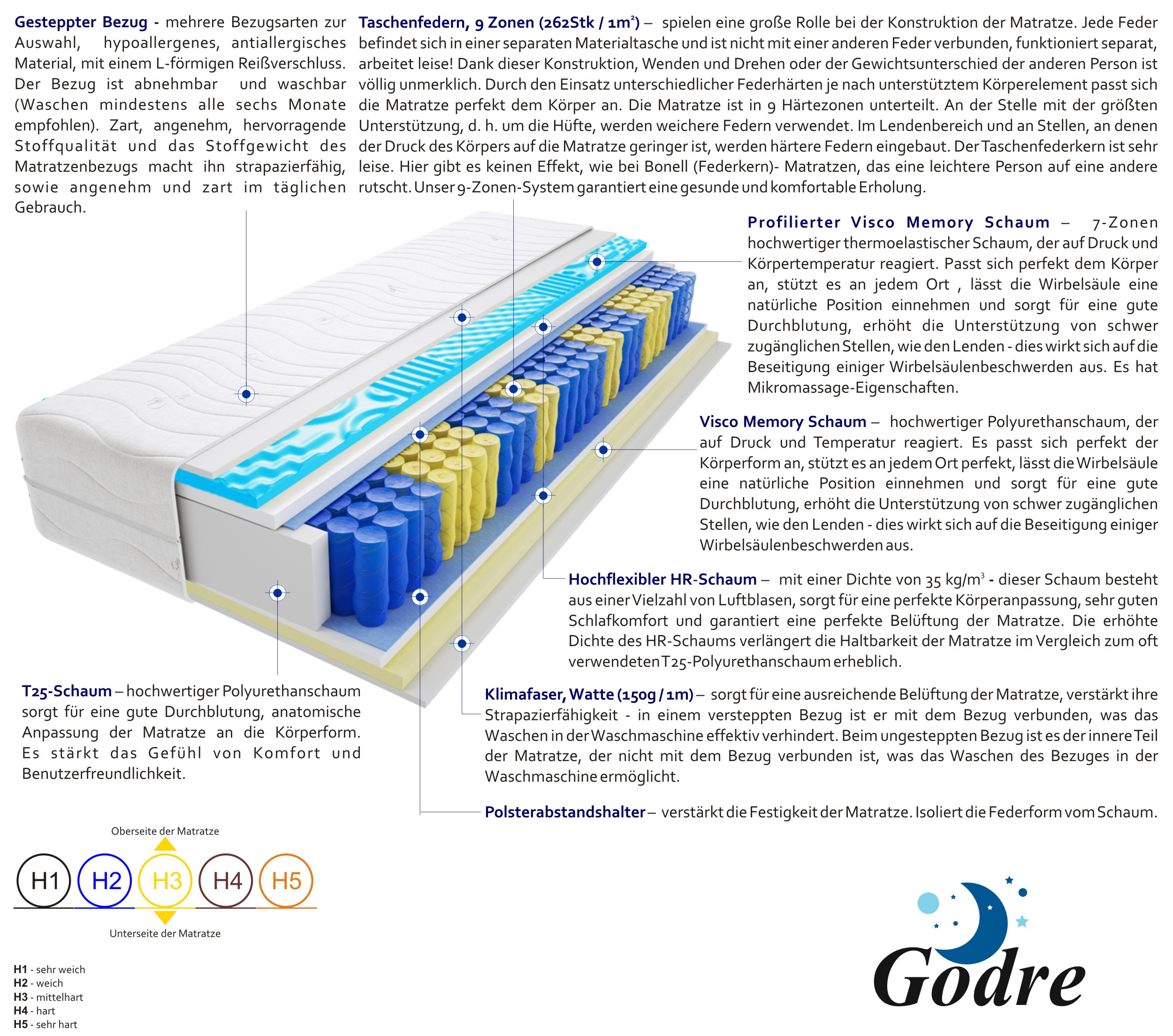 taschenfedern, hochelastischer-hr-schaum, visco-memory-schaum-2-cm, profilierter-visco-memory-schaum-2-cm, t25-schaum, klimafaser, filz, gesteppter-bezug
