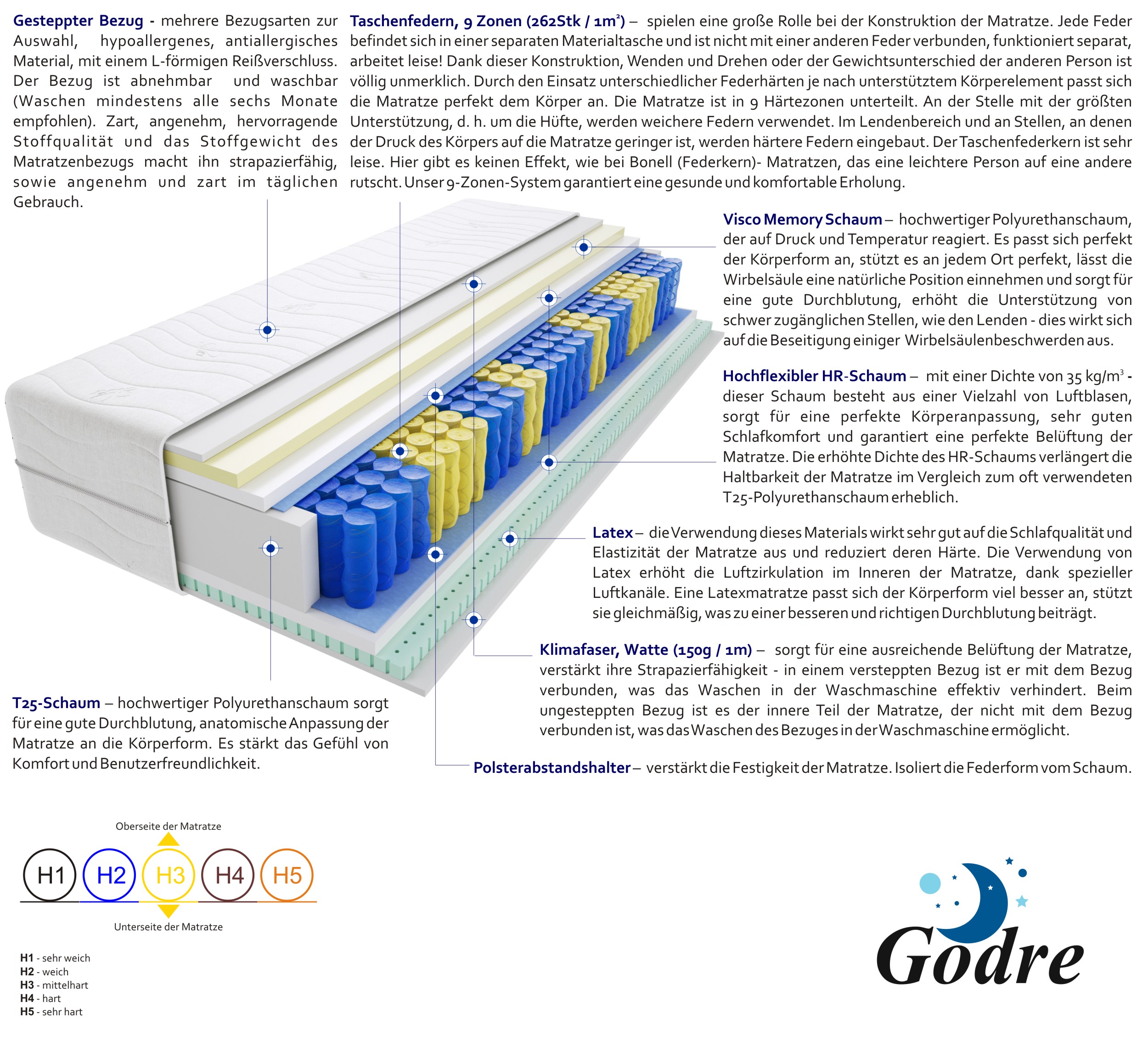 – spielen eine große Rolle bei der Konstruktion der Matratze. Jede Feder befindet sich in einer separaten Materialtasche und ist nicht mit einer anderen Feder verbunden, funktioniert separat, arbeitet leise! Dank dieser Konstruktion, Wenden und Drehen oder der Gewichtsunterschied der anderen Person ist völlig unmerklich. Durch den Einsatz unterschiedlicher Federhärten je nach unterstütztem Körperelement passt sich die Matratze perfekt dem Körper an. Die Matratze ist in 9 Härtezonen unterteilt. An der Stelle mit der größten Unterstützung, d.h. um die Hüfte, werden weichere Federn verwendet. Im Lendenbereich und an Stellen, an denen der Druck des Körpers auf die Matratze geringer ist, werden härtere Federn eingebaut. Der Taschenfederkern ist sehr leise. Hier gibt es keinen Welleneffekt, wie bei Bonellfedernkernmatratzen, das eine leichtere Person auf eine andere rutscht. Unser 9-Zonen-System garantiert eine gesunde und komfortable Erholung.