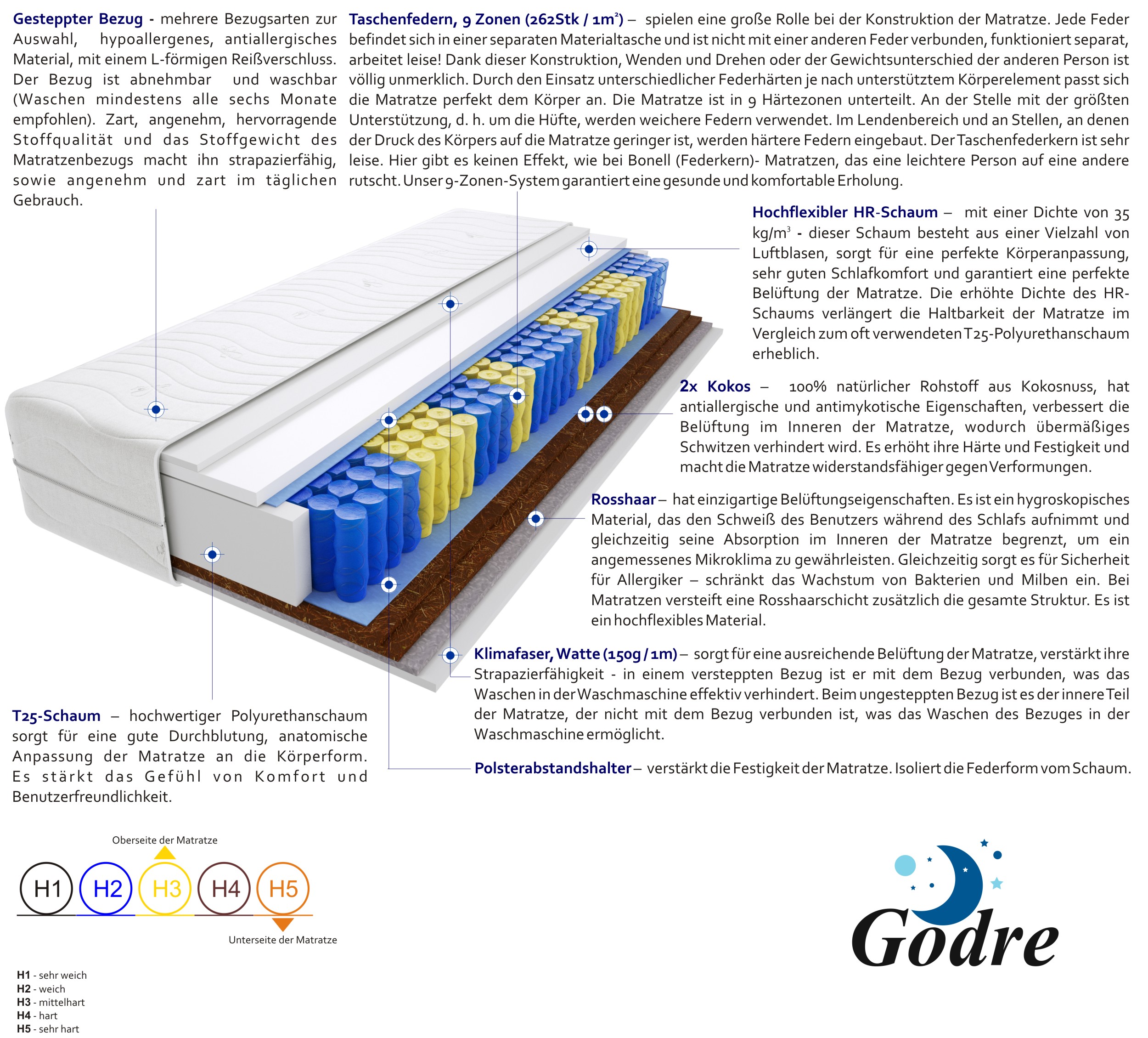 taschenfedern, hochelastischer-hr-schaum, 2x-kokos, rosshaar, t25-schaum, klimafaser, filz, gesteppter-bezug