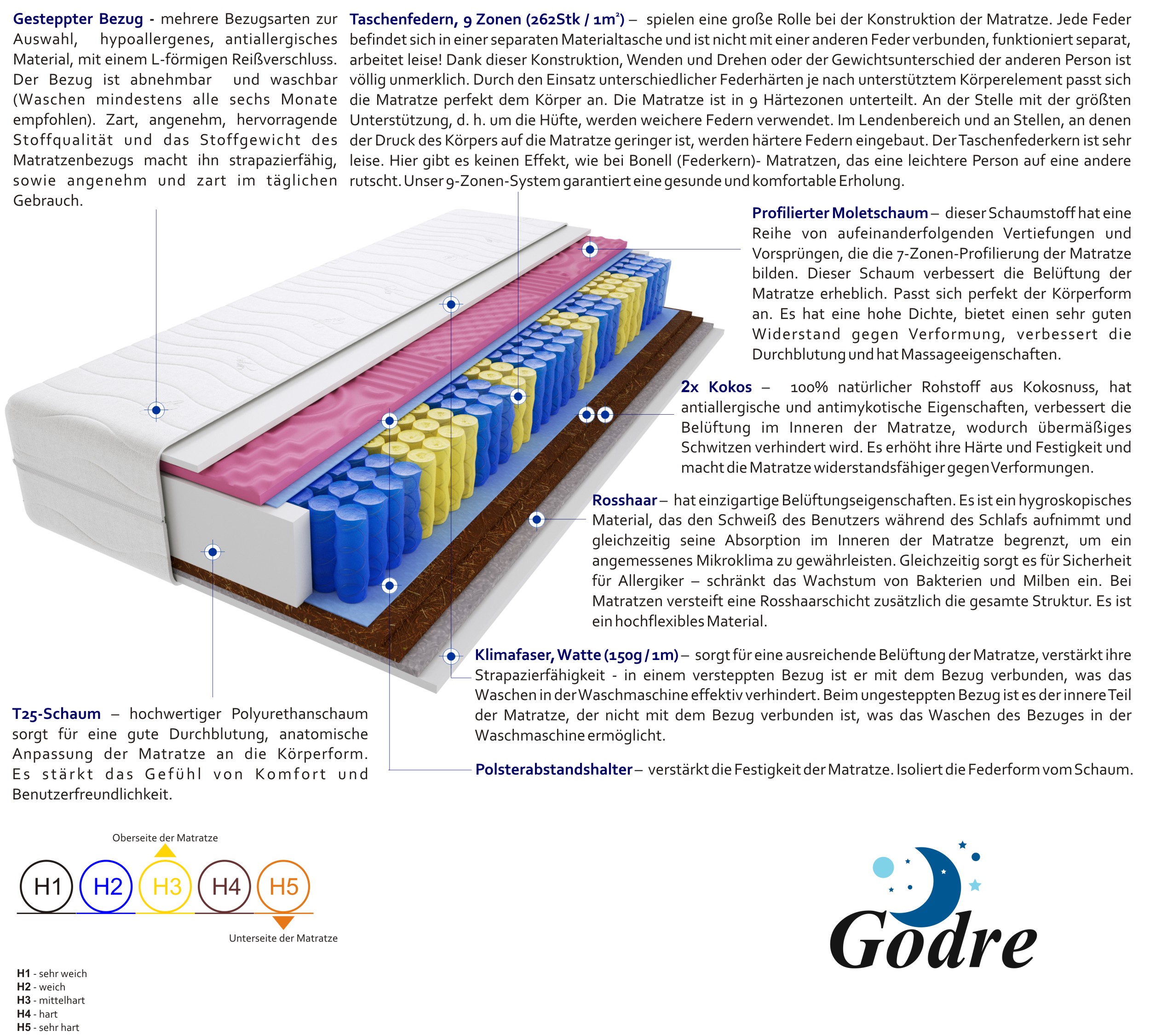 – spielen eine große Rolle bei der Konstruktion der Matratze. Jede Feder befindet sich in einer separaten Materialtasche und ist nicht mit einer anderen Feder verbunden, funktioniert separat, arbeitet leise! Dank dieser Konstruktion, Wenden und Drehen oder der Gewichtsunterschied der anderen Person ist völlig unmerklich. Durch den Einsatz unterschiedlicher Federhärten je nach unterstütztem Körperelement passt sich die Matratze perfekt dem Körper an. Die Matratze ist in 9 Härtezonen unterteilt. An der Stelle mit der größten Unterstützung, d.h. um die Hüfte, werden weichere Federn verwendet. Im Lendenbereich und an Stellen, an denen der Druck des Körpers auf die Matratze geringer ist, werden härtere Federn eingebaut. Der Taschenfederkern ist sehr leise. Hier gibt es keinen Welleneffekt, wie bei Bonellfedernkernmatratzen, das eine leichtere Person auf eine andere rutscht. Unser 9-Zonen-System garantiert eine gesunde und komfortable Erholung.