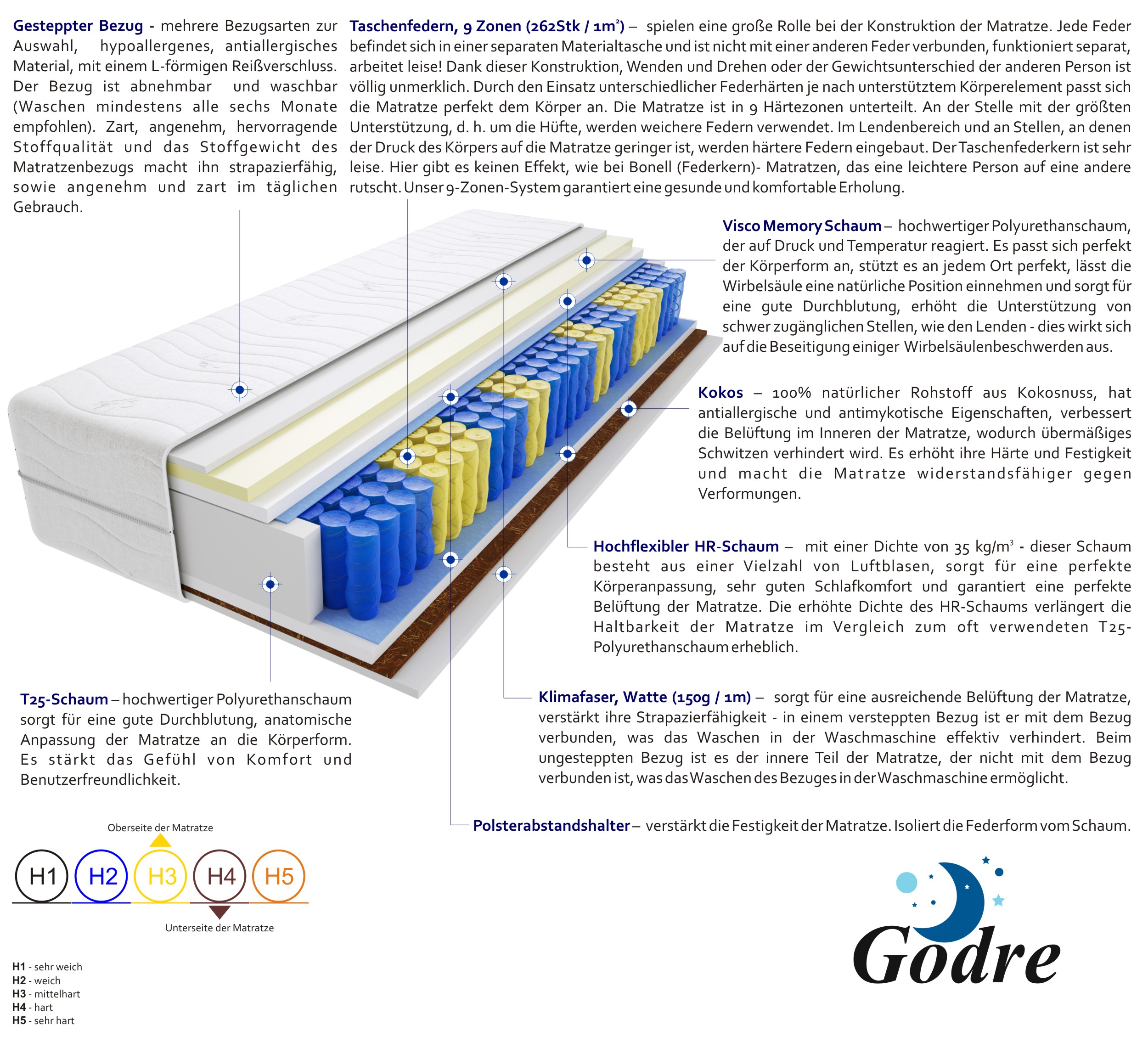 taschenfedern, hochelastischer-hr-schaum, visco-memory-schaum-2-cm, kokos, t25-schaum, klimafaser, filz, gesteppter-bezug