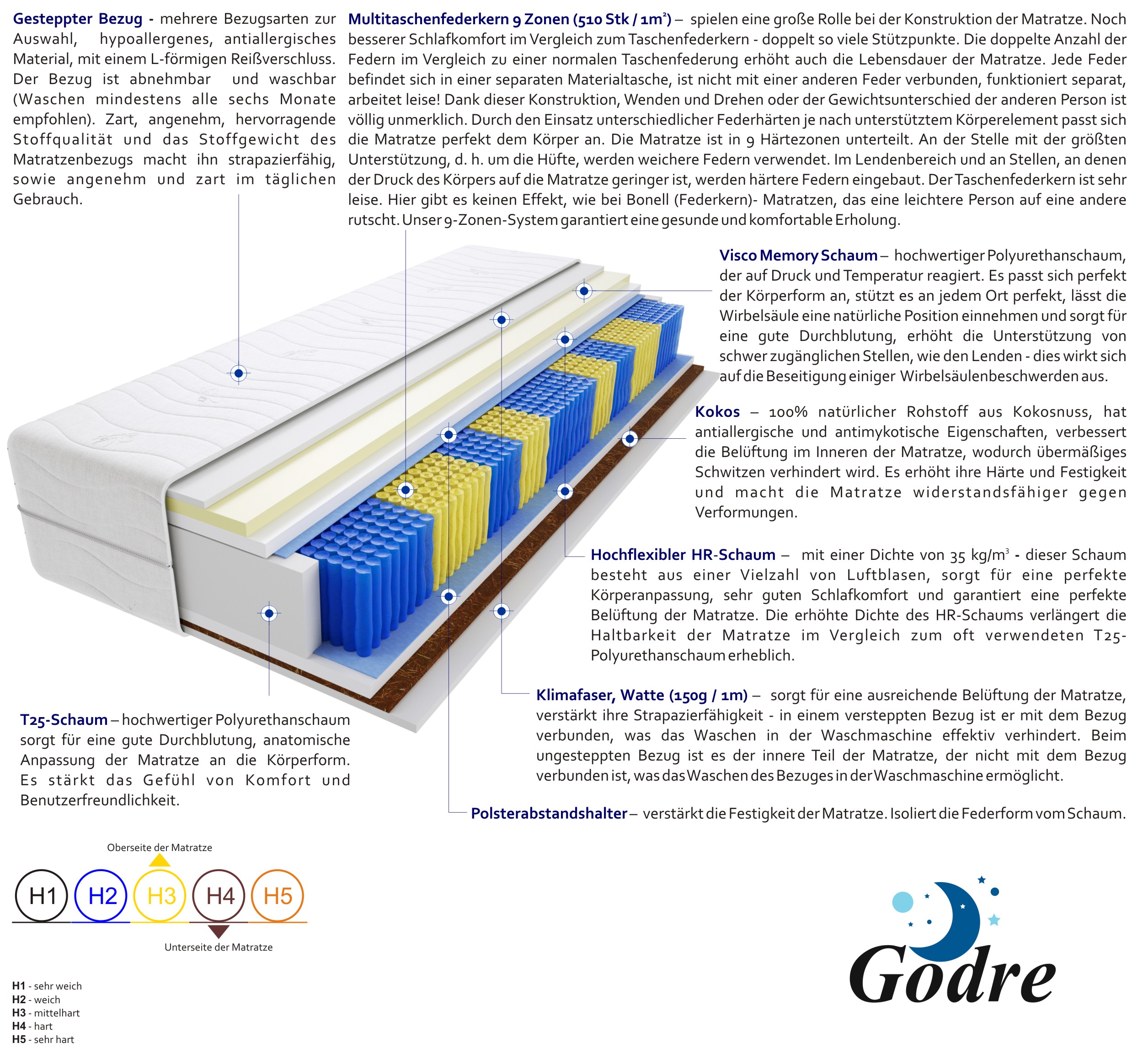 multitaschenfedern, hochelastischer-hr-schaum, visco-memory-schaum-2-cm, kokos, t25-schaum, klimafaser, filz, gesteppter-bezug