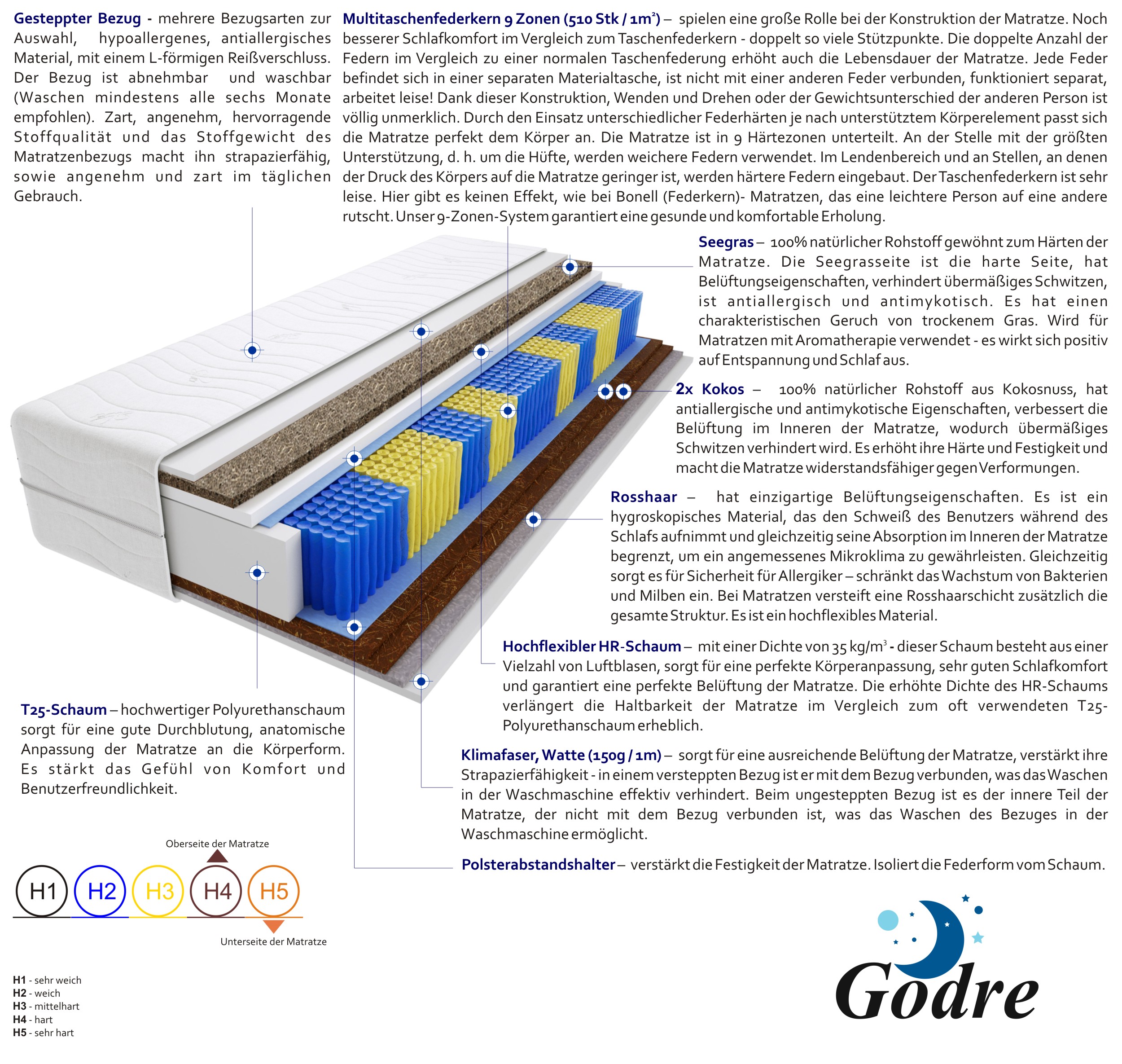multitaschenfedern, hochelastischer-hr-schaum, seegras, 2x-kokos, rosshaar, t25-schaum, klimafaser, filz, gesteppter-bezug