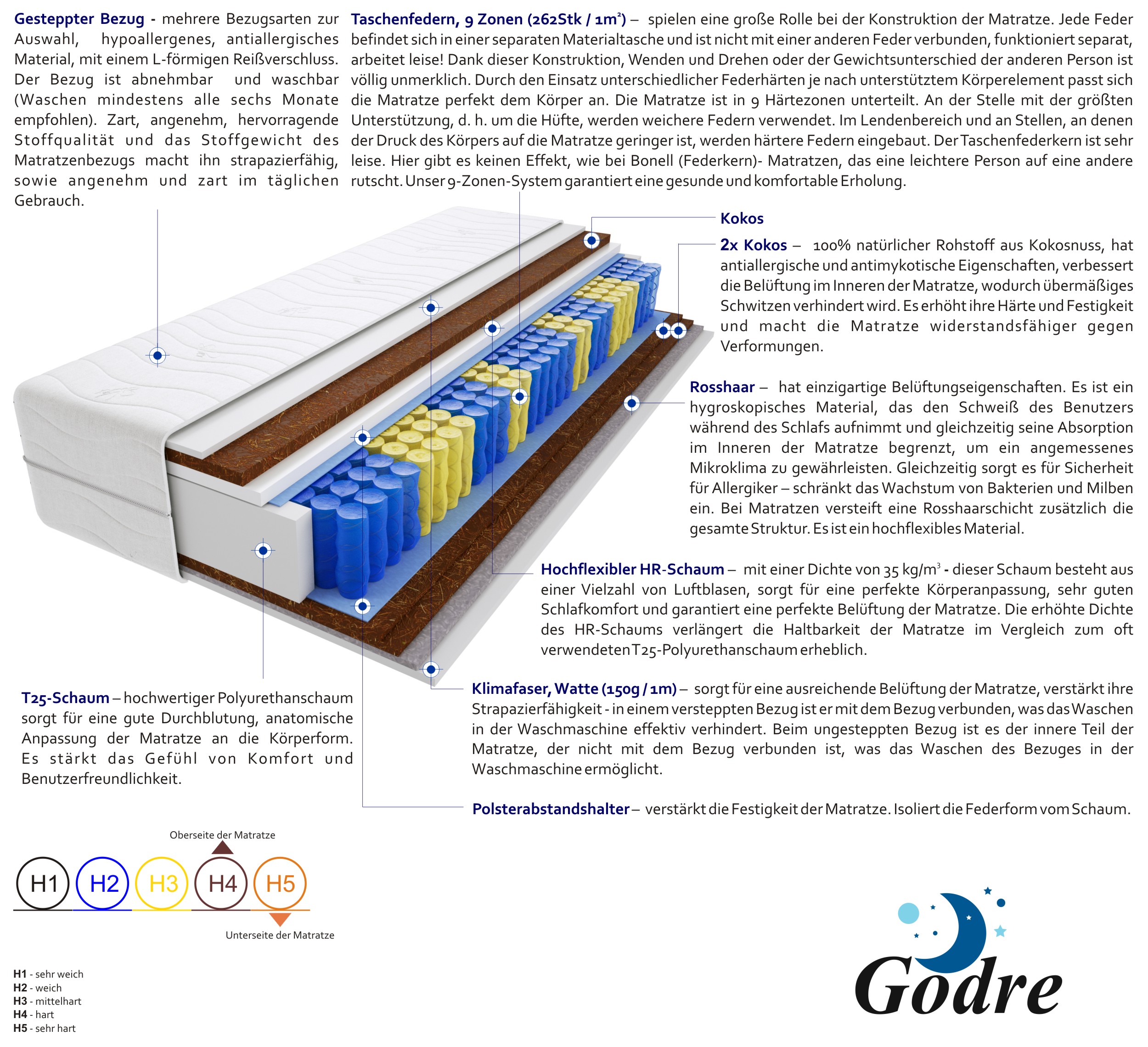 – spielen eine große Rolle bei der Konstruktion der Matratze. Jede Feder befindet sich in einer separaten Materialtasche und ist nicht mit einer anderen Feder verbunden, funktioniert separat, arbeitet leise! Dank dieser Konstruktion, Wenden und Drehen oder der Gewichtsunterschied der anderen Person ist völlig unmerklich. Durch den Einsatz unterschiedlicher Federhärten je nach unterstütztem Körperelement passt sich die Matratze perfekt dem Körper an. Die Matratze ist in 9 Härtezonen unterteilt. An der Stelle mit der größten Unterstützung, d.h. um die Hüfte, werden weichere Federn verwendet. Im Lendenbereich und an Stellen, an denen der Druck des Körpers auf die Matratze geringer ist, werden härtere Federn eingebaut. Der Taschenfederkern ist sehr leise. Hier gibt es keinen Welleneffekt, wie bei Bonellfedernkernmatratzen, das eine leichtere Person auf eine andere rutscht. Unser 9-Zonen-System garantiert eine gesunde und komfortable Erholung.
