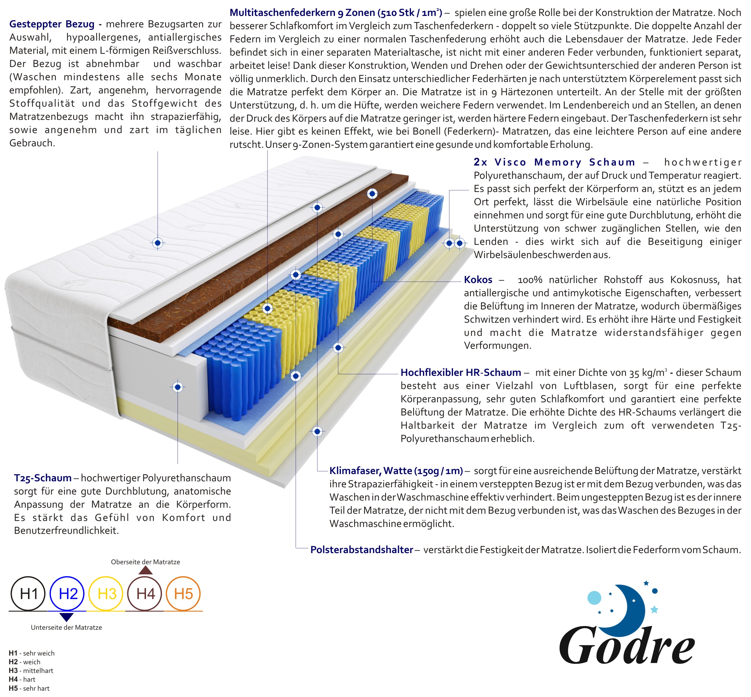 multitaschenfedern, hochelastischer-hr-schaum, 2x-visco-memory-schaum-2-cm, kokos, t25-schaum, klimafaser, filz, gesteppter-bezug