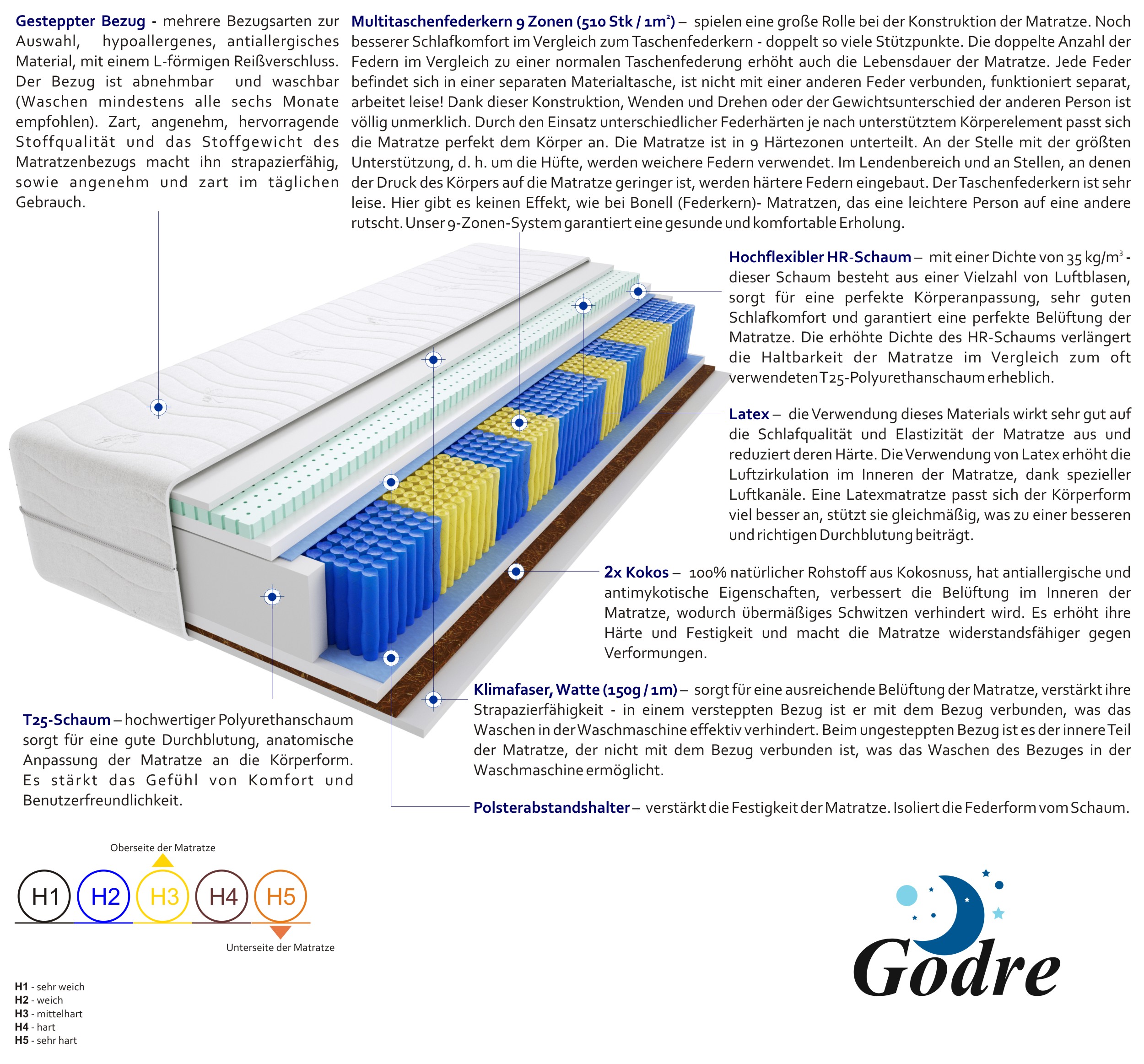 multitaschenfedern, hochelastischer-hr-schaum, latex-2-cm, 2x-kokos, t25-schaum, klimafaser, filz, gesteppter-bezug
